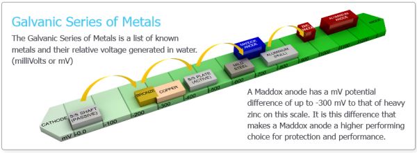 For many corrosion specialists, zinc anodes are no longer the preferred anode for wooden boats. This because they simply cause overprotection. Where timber boats require between 500 – 550mV for protection, zinc creates 950mV & aluminium 1050mV and will always overprotect a timber shaft driven vessel. The Maddox anode however, was developed in Australia for timber vessels and designed to produce a lower voltage. Whilst still providing cathodic protection against corrosion, overprotection reactions are markedly reduced when using Maddox Anodes. The improvements to anode efficiencies result in better outcomes to timber integrity, coating performance and a reduction in growth.