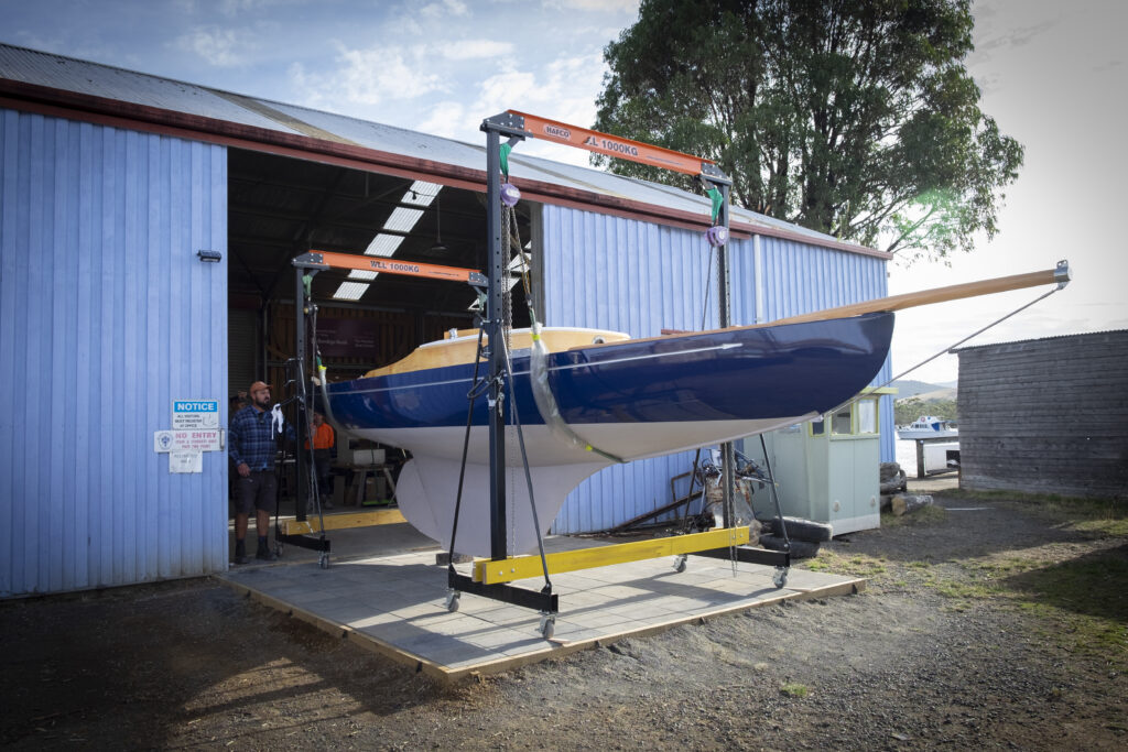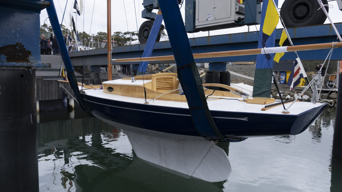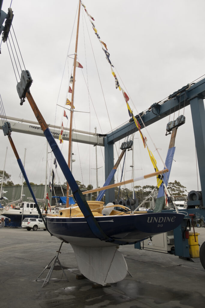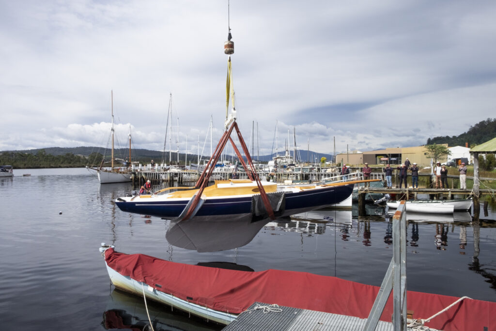 On Saturday 10th February, 2024, as part of the Kettering Wooden Boat Rally, we had the pleasure of ‘relaunching’ Undine. In front of a crowd of 100+ wooden boat enthusiasts Undine was delicately lowered into the waters of the D’Entrecasteaux Channel at approximately 10:21am, by the team at the generous Oyster Cove Marina (who originally lifted her out of the water, put her on a truck and said “there you go, she’s all yours!” some two years ago).