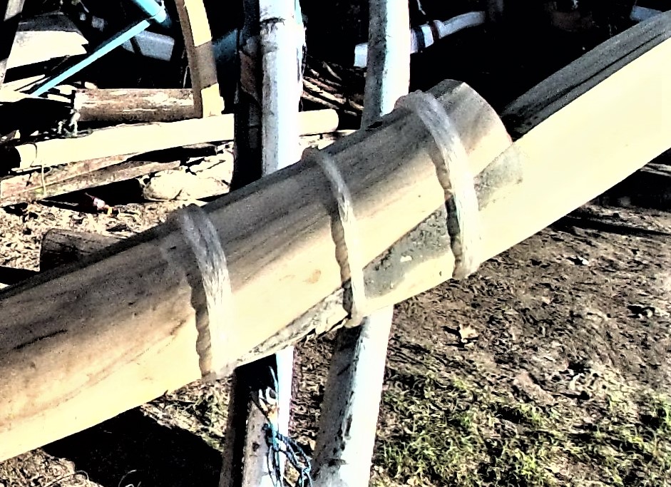 Short flat transverse boards, with square holes, layang layang, for the mast, and penyankilang, for the rudder assembly, are let into the hull. These provide a base for the upwardly curving outrigger booms, banyungang. A pegged scarf joint connects the downwardly curving pieces, cedik, which connect to the bamboo floats, kantih. These assembly are lashed to the transverse hull braces, sendung.