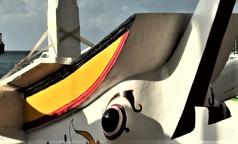 The distinctive eyes on the bow, which ward off evil spirits and guide the boat back to port, are part of the Gagah Minah, Elephant Fish, with large jaws and a tail. These pieces are also made from the original belalu log. The new fibreglass Jukungs have none of these iconic features.