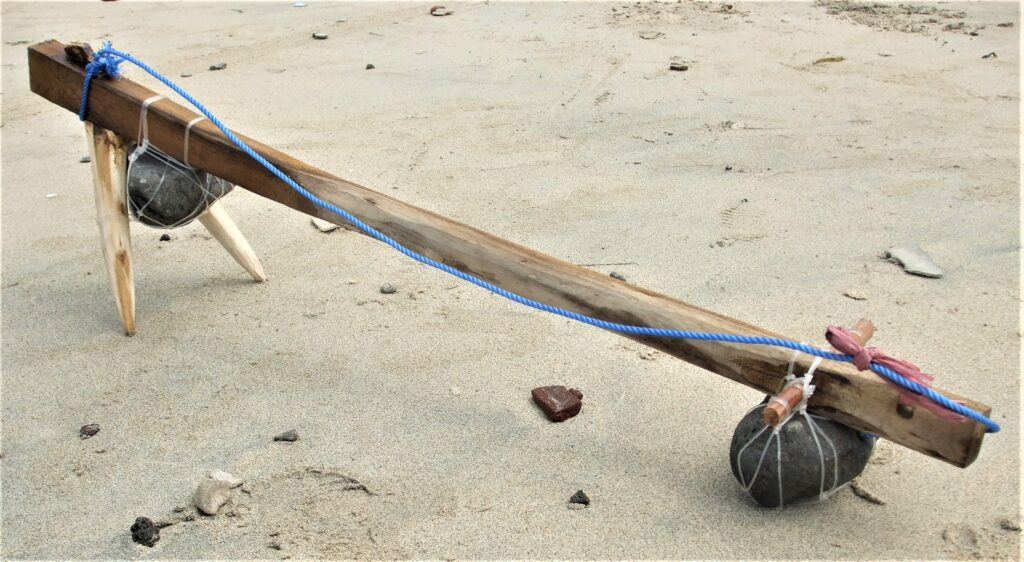 The mast, outriggers, and other fittings are made from the locally growing Waru tree, Hibiscus tiliaceus, more commonly known as Sea Hibiscus. It was introduced to the region by Austronesian people as a source of timber and rope making from the bark.