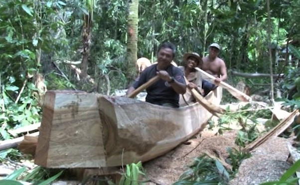 The stem pieces, off cuts from the log, are fitted first, followed by planks for the gunwales, chainsawed from in side the hull. The main tools are a small handed axe and an adze with an adjustable head, thought to have originated a thousand years ago in what is now the Philippines.
