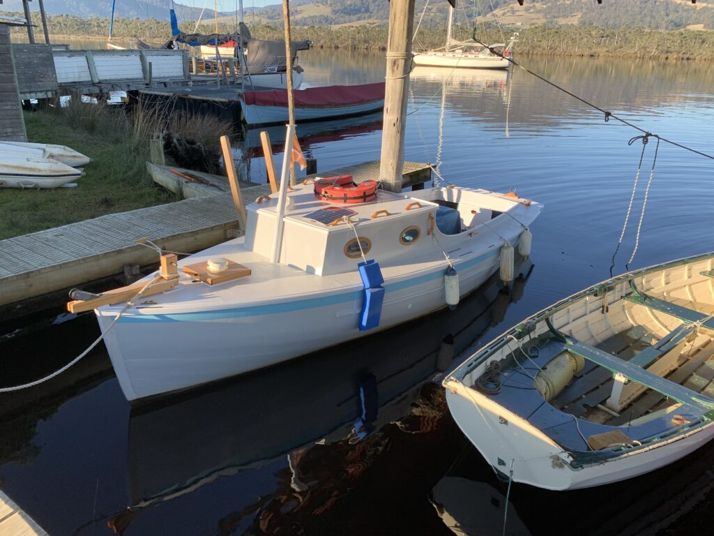 This lovely little boat was built by Spence Harrison at Eaglehawk Neck as a fishing boat in in the post-war era, later purchased by Dr. Eric and Susan Fricker of Premaydena on the Tasman Peninsula. The boat was used for many years as a family fishing boat and runabout in Norfolk Bay. Dr. Fricker passed away in 2018, by which time the old boat had lain in the yard for many years. Sue Fricker, well-known local artist, decided to donate the boat to the Wooden Boat Centre, where shipwrights and volunteers completed a loving renovation and returned the Jane de Cray to service as a river launch and day boat on the Huon River. Her home port is Franklin at the Wooden Boat Centre wharf.